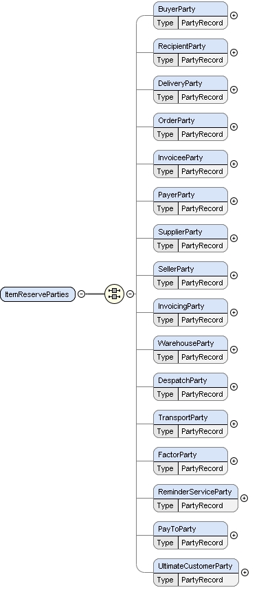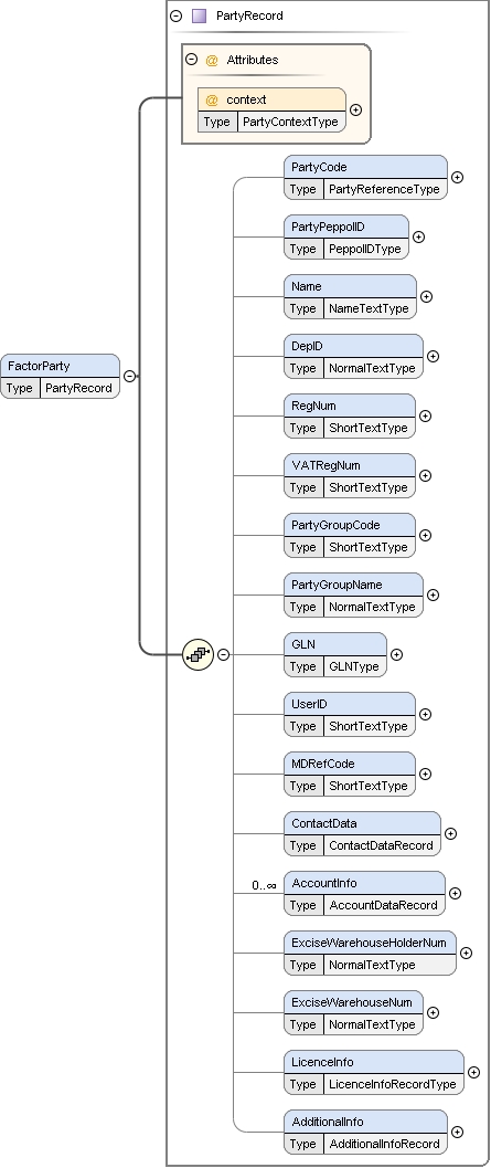 PartyCode{0,1} , PartyPeppolID{0,1} , Name{0,1} , DepID{0,1} , RegNum{0,1} , VATRegNum{0,1} , PartyGroupCode{0,1} , PartyGroupName{0,1} , GLN{0,1} , UserID{0,1} , MDRefCode{0,1} , ContactData{0,1} , AccountInfo* , ExciseWarehouseHolderNum{0,1} , ExciseWarehouseNum{0,1} , LicenceInfo{0,1} , AdditionalInfo{0,1}